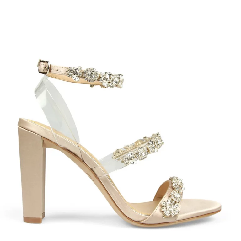Clear accents lend a floating effect to the crystal-embellished straps on Blake by HARLO. If your gown is simplistic and silk or draped in beading, Blake’s versatility makes her a staple piece in the collection and will effortlessly complete your bridal look.