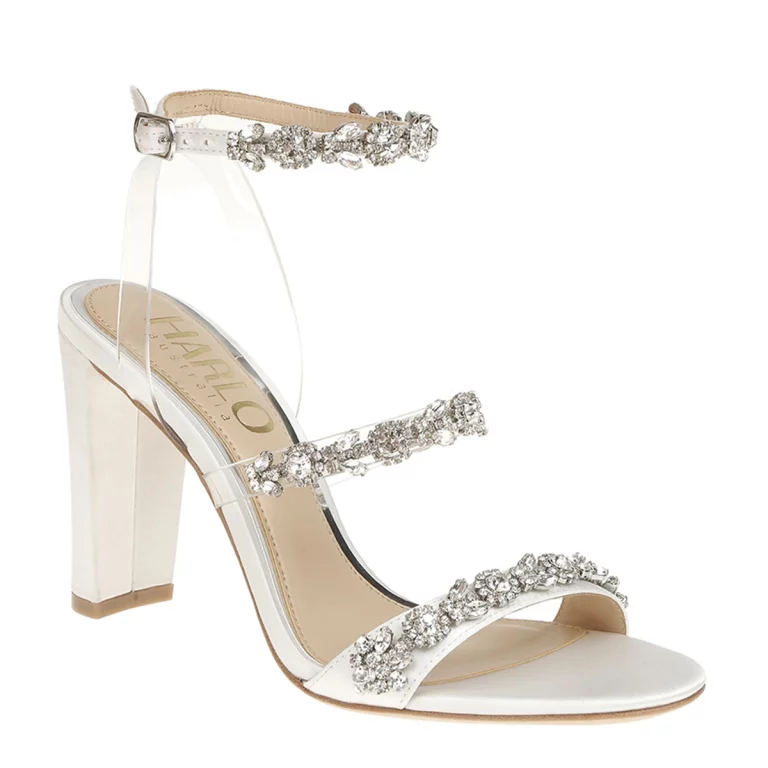 Clear accents lend a floating effect to the crystal-embellished straps on Blake by HARLO. If your gown is simplistic and silk or draped in beading, Blake’s versatility makes her a staple piece in the collection and will effortlessly complete your bridal look.